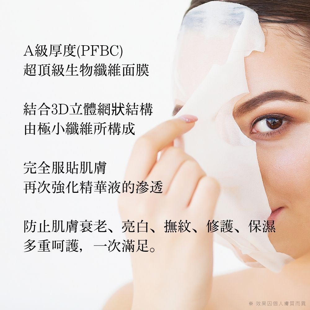 2.面膜共三層,取出中間的生物纖維面膜敷於臉上約20分鐘(敏感肌膚約15分鐘)