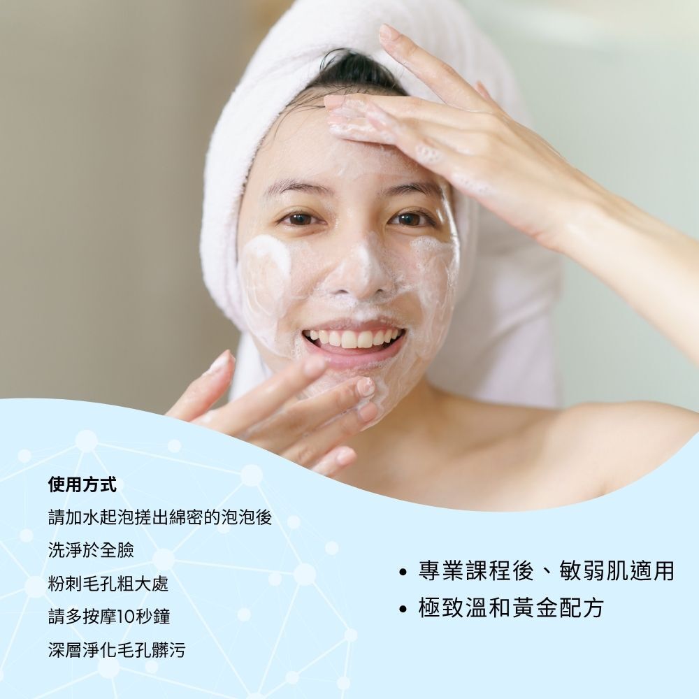請加水起泡搓出綿密的泡泡後,均勻洗淨全臉。針對毛孔粗大或油光明顯處,請加強按摩 10 秒鐘,幫助深層潔淨、帶走毛孔髒污與多餘油脂。