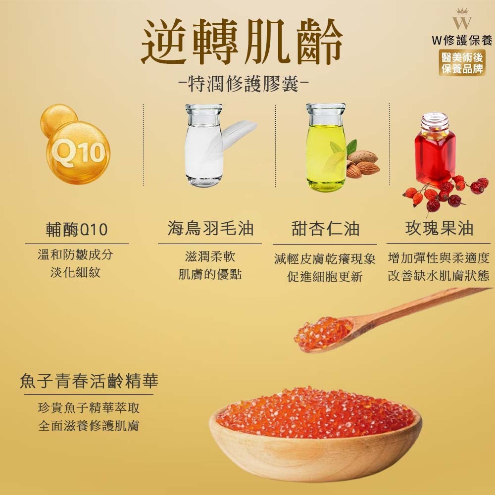 蠶絲油、海鳥羽毛油、甜杏仁油、玫瑰果油、齊籃籽油、輔酶Q10、維他命E、低分子玻尿酸精華、維他命B5、魚子青春活齡精華